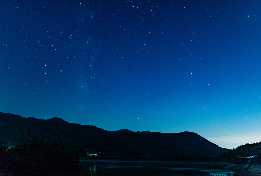 流星群が見れる時期でもあり現地は車の多く、多くの方が星空鑑賞を楽しんでました。撮影の方は21時から約2時間位で、これから深夜の23時には退散しました。そのため山の谷間から向こうの明かりが非常に多く明るくなっています。これはフィルターを導入して減らす方法もありますが、それはまた後日。今回はダム湖奥からの撮影でしたので、次回はダム上部の道から山に向かって撮影してみたいと思います。