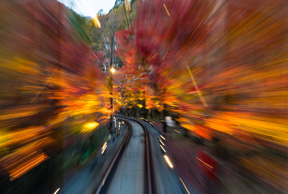 PHOTO叡山電車で秋散策 2023年10月9日 /紅葉の名所でもある鞍馬へ叡山電車に乗って行ってきました。行ったのは平日で比較的早い時間だったので乗客は少なめでしたので、話題になった電車の中からの長時間露光をやってみました。列車の揺れと手でしっかり固定するのが中々難しく上手く撮れる方は凄いですね。