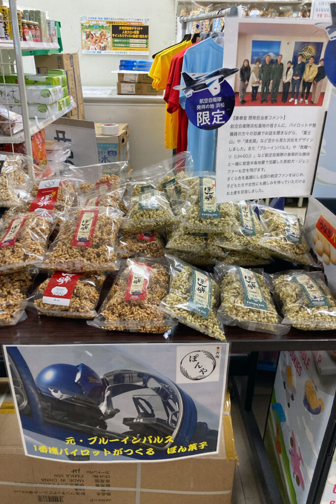 基地内のコンビニでは浜松基地内限定の品物も販売されていました。私は基地オリジナルタオルとこちらのぽん菓子を購入しました。こちらのぽん菓子は何と元ブルーインパルス1番機のパイロットの方が作られているという事で、これもまたお土産にもばっちりです。