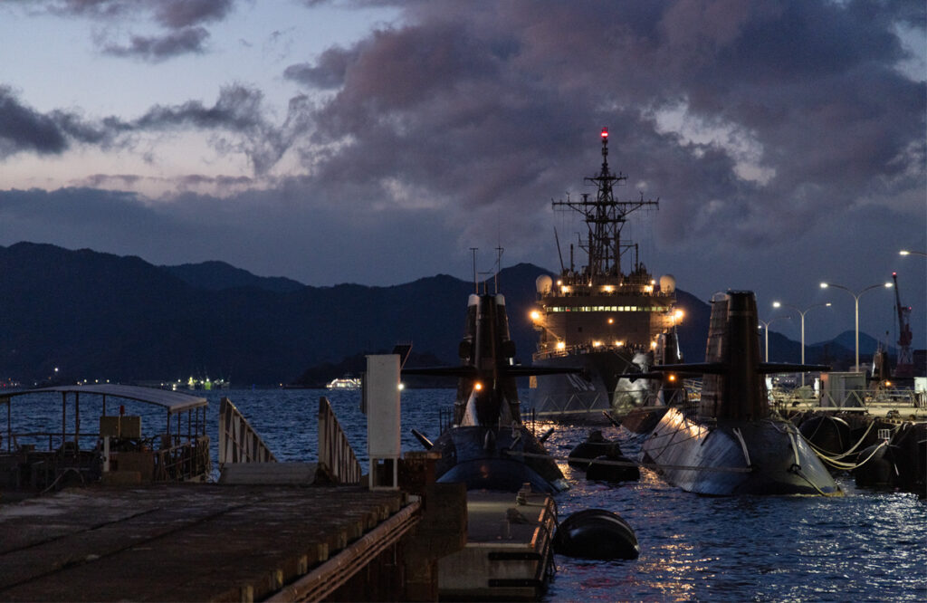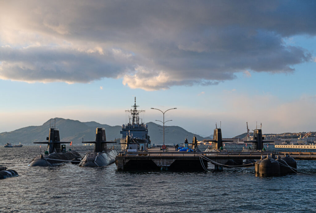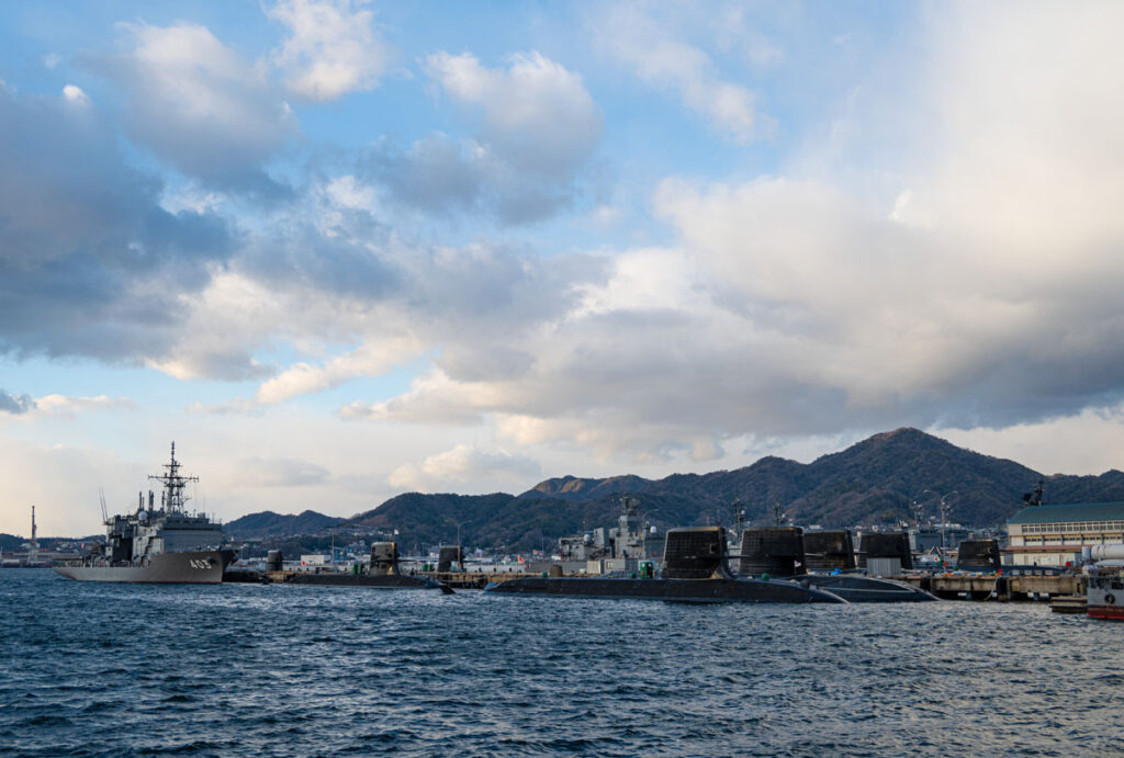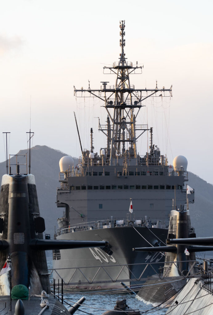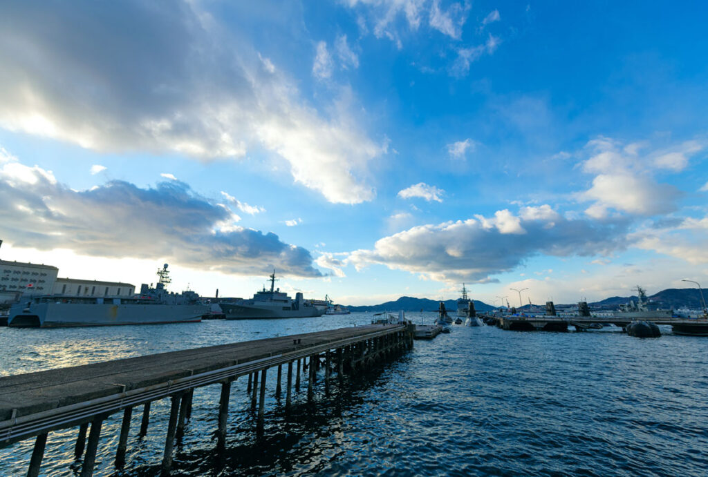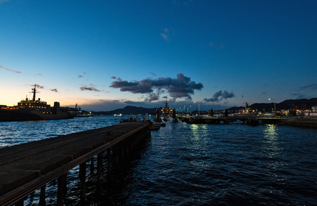 自衛隊アレイからすこじま 2025年2月13日 /潜水艦を非常に近くで見る事ができるアレイからすこじまへやってまいりました。時間は17時少し前で日没までは約50分と、夕焼けと夜の姿を撮る事ができればと考えておりましたが、日没後は急激に温度が下がるのと海風で非常に寒い。寒い所での撮影は何度も経験がありますが海風は辛かった。最後の方は指が冷えて設定を変えるのに一苦労しております。冬は夕日が建物側へ沈みますので、海へ沈む夕日を入れての写真を求めて秋頃にもう一度トライしたいと思います。
