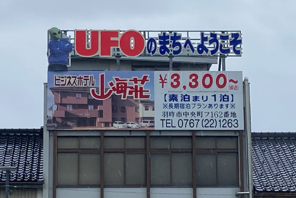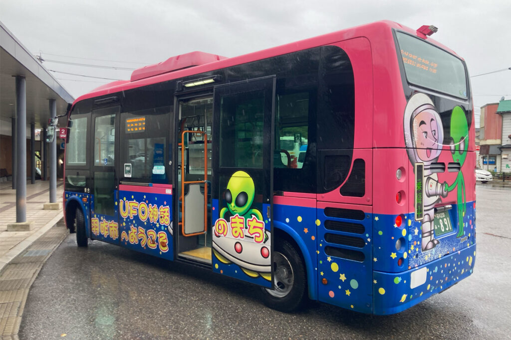 コスモアイル羽咋からJR羽咋駅までは徒歩で15分から20分くらいで歩けるのですが、1時間に1本程度バスが運転されています。そしてその運転されてるバスがこちら。とおーーーくからもバスがきた事が非常に分かりやすかったです。そして駅の中にも宇宙人(笑)駅を出て初めに見える看板は…流石でございます。にしても、ビジネスホテルの宿泊料金安いなぁ。