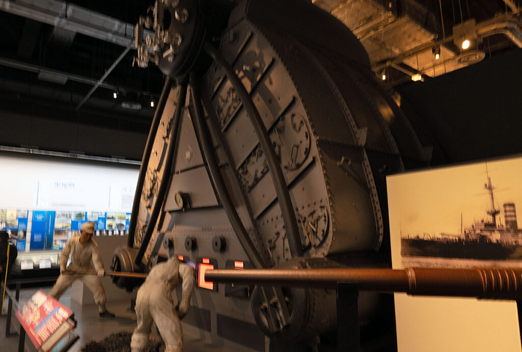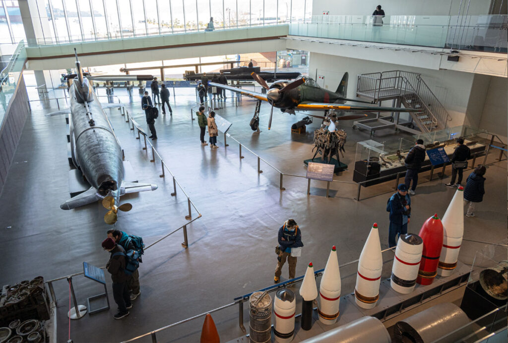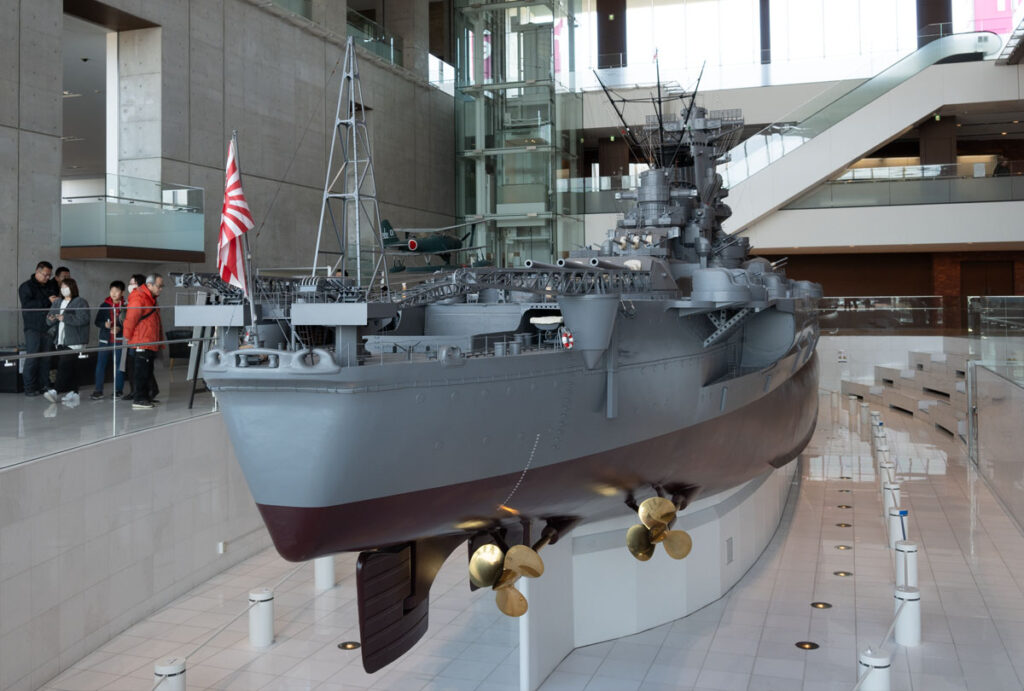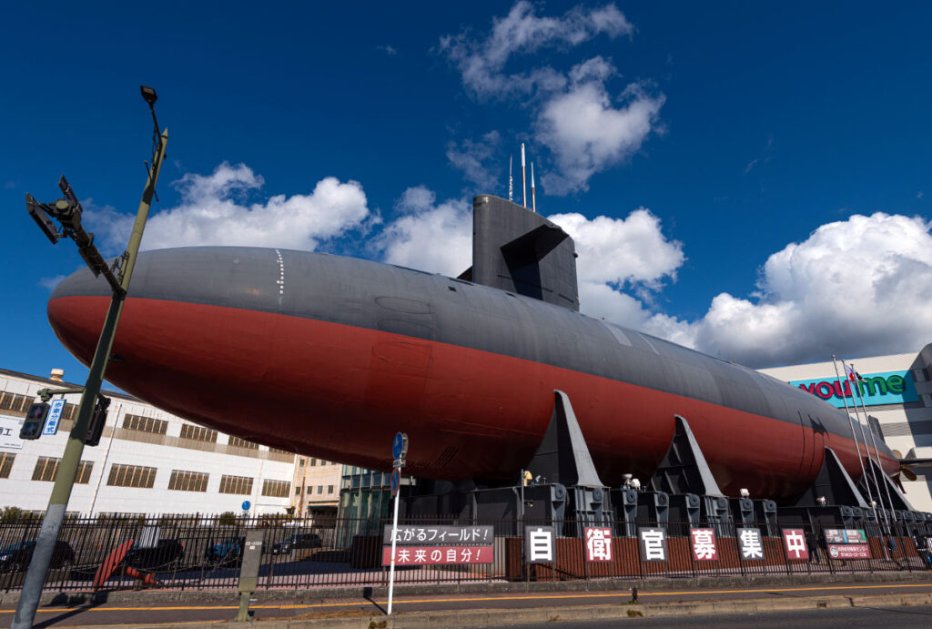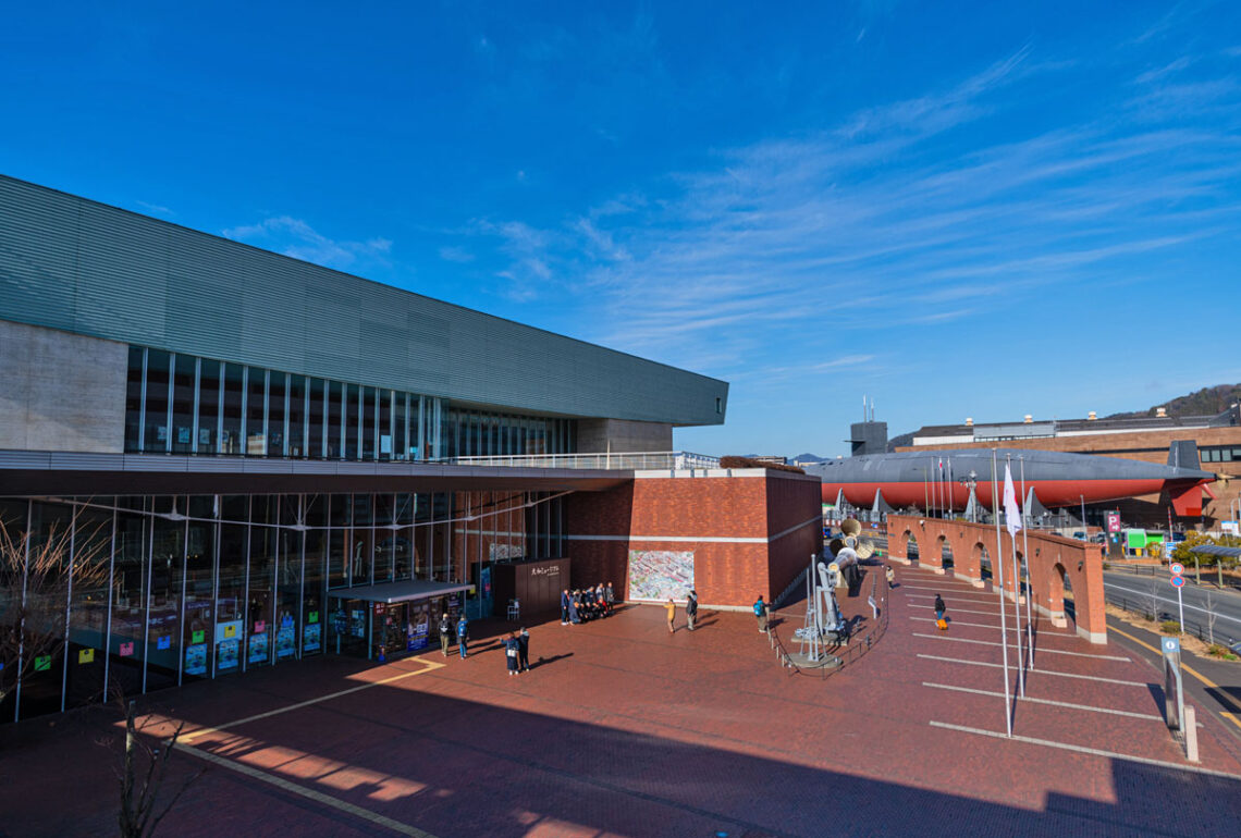 続いて大和ミュージアムの向かいにある「海上自衛隊呉資料館 愛称 てつのくじら館」へ。正面にはどどんと潜水艦のあきしおが鎮座しており、あきしおのお腹の下を通り入館していきます。館内はフロアごとに内容が変わり、最後に潜水艦あきしおの艦内を見学します。